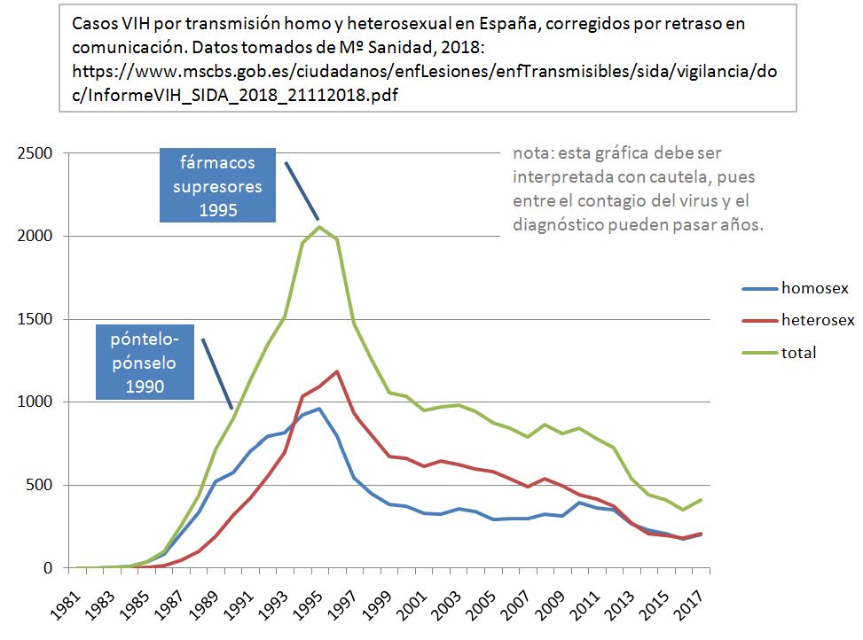 Por último, no me resisto a poner otra gráfica que puede ser interesante, sobre los casos de VIH, relacionados con el comportamiento sexual. En su interpretación hay que ser más cautelosos, pues entre el contagio del VIH y su diagnóstico, pueden pasar años: